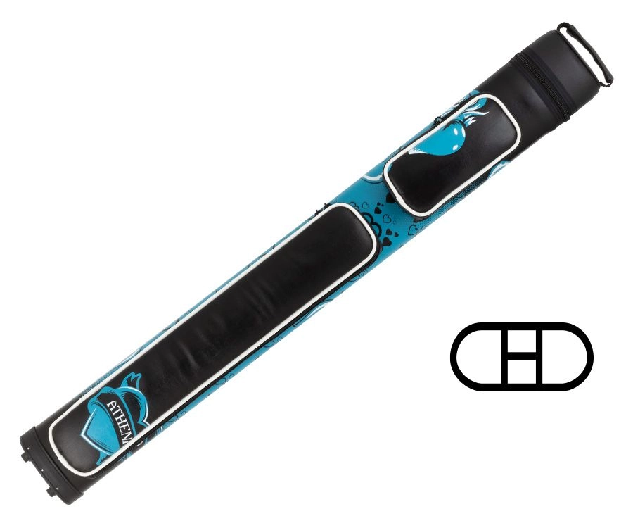This Pool Cue Case from Athena features a turquoise and black hearts design with black pockets, two backpack-style straps, and a top carrying handle. Thanks to its two external pockets you’ll have room for any accessories essential to any player.