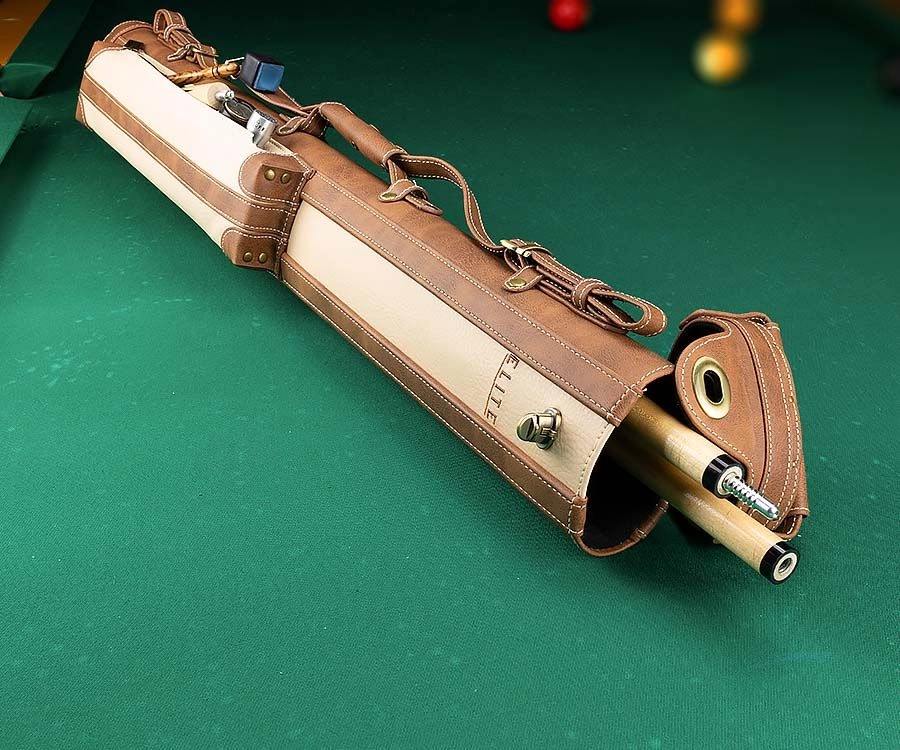 Made of 2 tone brown leather and vinyl, with white stitching, this case looks sweet! It has carrying handle on the top and side and a shoulder strap that can be fixed to the handle to keep it out of the way.